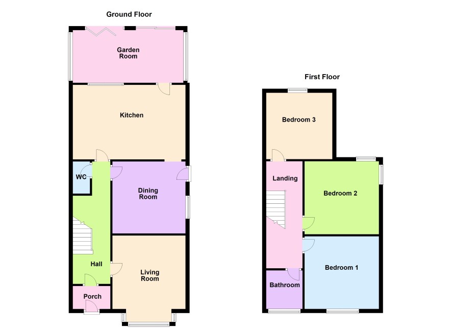 Enclosed Porch with door to Hallway with W.C, stairs off and access to Lounge 3.6m x 3.6m with bay to front. Dining Room 3.6m x 3.6m with door to side and access to Kitchen. Kitchen 5.6m x 3.2m with range of units and door to Garden Room 5.6m x 2.67m with bi fold doors to rear Gardens.