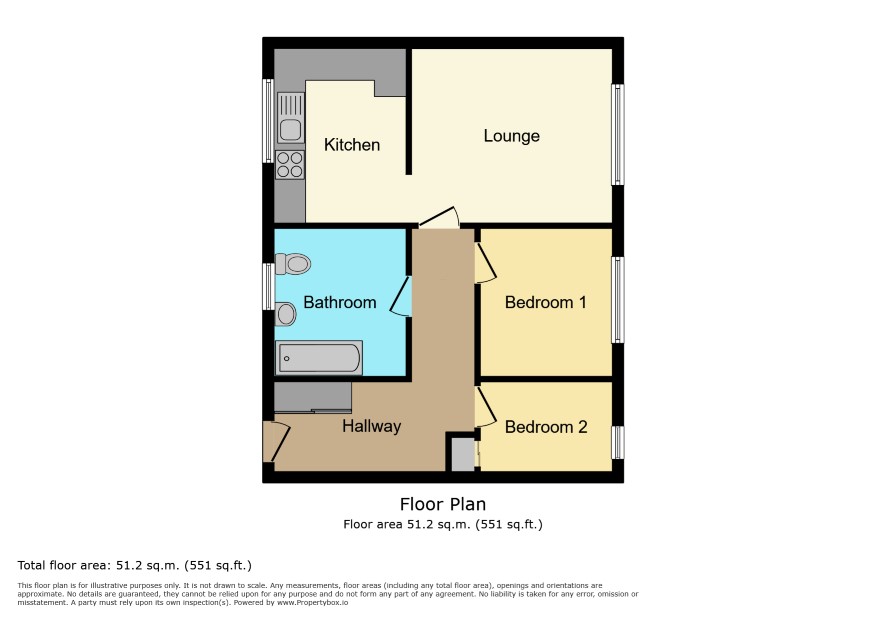 FIRST FLOOR Hallway: Lounge: 13 ft 3 in x 9 ft 11 in Kitchen: 9 ft 10 in x 6 ft 2 in Bedroom 1: 10 ft 3 in x 9 ft Bedroom 2: 10 ft 5 in x 6 ft 3 in Bathroom: