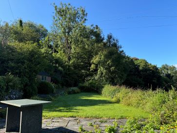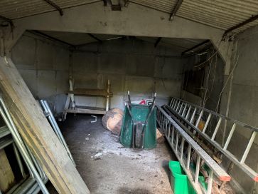 Garden with three outbuildings, brick built shed, currently used for storing garden equipment and a stone built store used as a wood store. Garage and drive.