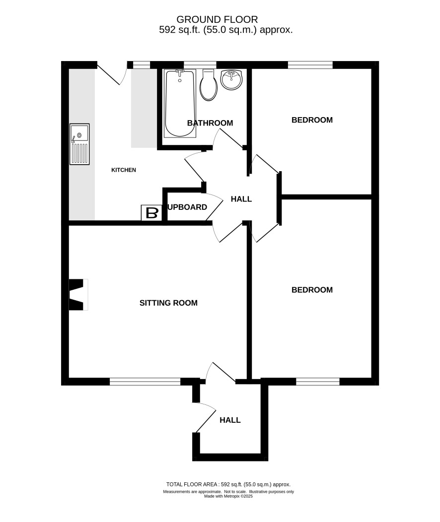 Entrance lobby, lounge, inner hall, two bedrooms, bathroom, kitchen.