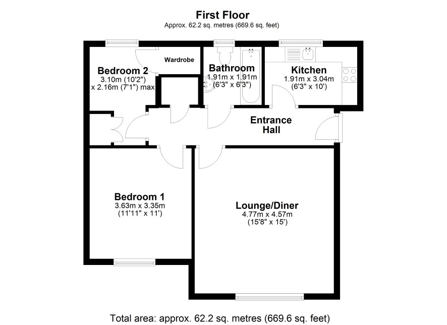 Entrance hall, living room/dining room, kitchen, two bedrooms and a bathroom