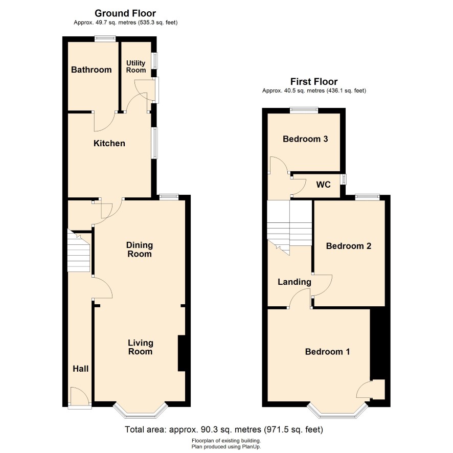 Ground Floor: Entrance Hall Living Room 13' 10" max into bay x 10' 11" max ( 4.22m max into bay x 3.33m max ) Dining Room 12' 6" max x 11' 3" max ( 3.81m max x 3.43m max ) Kitchen 10' 2" max x 10' max ( 3.10m max x 3.05m max ) Bathroom 8' 3" max x 6' 1" max ( 2.51m max x 1.85m max ) Utility Room 8' 3" max x 3' 9" max ( 2.51m max x 1.14m max ) First Floor: Landing Bedroom 1 14' 7" max x 11' 1" max ( 4.45m max x 3.38m max ) Bedroom 2 12' 4" max x 9' 3" max ( 3.76m max x 2.82m max ) Bedroom 3 8' 9" max x 6' 6" max ( 2.67m max x 1.98m max ) WC 4' 2" max x 2' 11" max ( 1.27m max x 0.89m max ) Outside Rear yard.