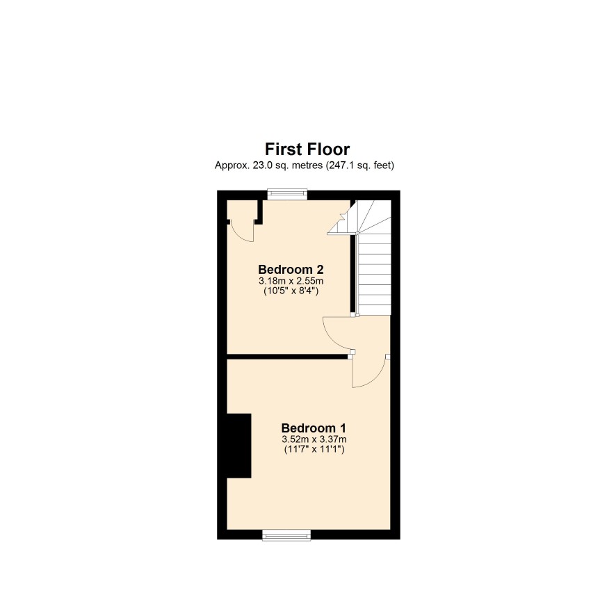 Ground Floor: Living Room, Dining Area, Kitchen, Bathroom. First Floor: Landing, two Bedrooms. Outside: Small courtyard to the front and rear.