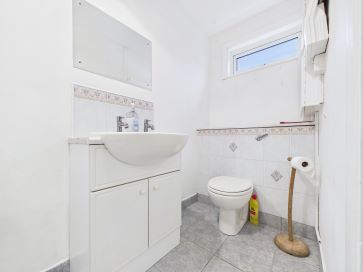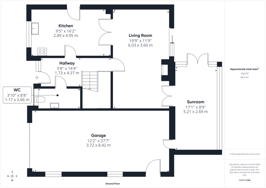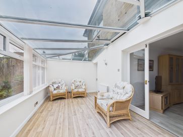 Entrance Hallway - 5'8" x 14'4" (1.73m x 4.37m) Radiator. Staircase to first floor. Doors leading to: WC - 3'10" x 8'8" (1.17m x 2.66m) Low flush WC, sink with pedestal and mixer tap. Plumbing for appliance. Kitchen - 9'5" x 16'2" (2.89m x 4.95m) Range of shaker style wall and base units. Eye-level electric oven and grill. Electric hob. Sink with mixer tap and right hand drainer. Side door to outside. Radiator. Double doors leading to: Living Room - 19'9" x 11'9" (6.03m x 3.60m) Radiator. Feature fireplace. Patio doors to outside. Door leading to: Sunroom - 17'1" x 8'9" (5.21m x 2.69m) Two radiators. French doors to outside. Door leading to: Garage - 12'2" x 27'7" (3.72m x 8.42m) Up and over garage door. Side door to outside.