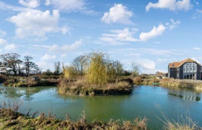 The property is set within expansive grounds, featuring a garden, a private fishing lake, and paddocks. Additionally, it includes a substantial five-car garage block and ample off-street parking.
