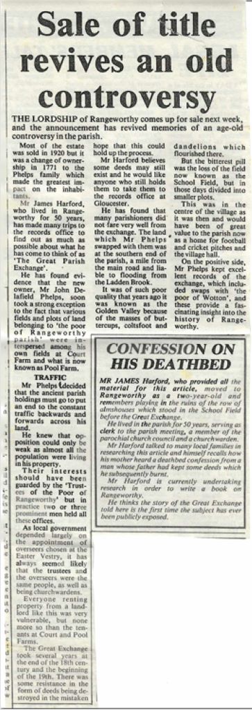 The Lordship of Rangeworthy is five miles south east of Thornbury and eleven miles north east of Bristol, in the Thornbury Hundred of Gloucestershire. The area of the lordship is about 800 acres. In the reign of King Edward II, Hugh de Audley was lord of the manor. He had married Piers Gaveston's widow after he was executed on the orders of the Earl of Lancaster. Gaveston had become too powerful as King Edward's favourite. In spite of having been banished twice, the King had invited him back and declared the banishment illegal. Margaret his widow, who became Hugh de Audley's wife was the daughter of the Earl of Gloucester, who was also beheaded. His execution took place after the Battle of Bannockburn in 1314. Hugh de Audley took the title of his wife's father after the execution and resided at Rangeworthy. From Hugh de Audley, the estate came to John Talbot, Viscount de Lisle and was later held by his widow, Joan, in 1368. By 1521, the Lordship had descended to Elizabeth Courtney, Countess of Devon. She had inherited the estate because a member of her family had married the de Lisle heiress, Elizabeth, who was lord of the manor in her own right in 1495. The Courtneys continued to hold the lordship until the title was conveyed to the Hale family who were in possession in 1608. Sir Matthew Hale, who was Chief Justice of England in the reign of King Charles II, was lord of the manor and lived at the principal residence in the village which has been named "The Court" since at least 1330. Several generations of Hales owned the estate. Mr Matthew Hale was lord of the manor and living at The Court Court in 1712. In 1771 the important local family of Phelps acquired the lordship, which was passed early this century to a relative of theirs, Arthur Clifford, in who's family the title remained until 1988 when the title was sold in an auction room to the current seller.