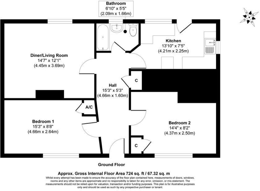 Entrance Hall Living/Dining Room: 14'7" x 12'1" Kitchen: 13'10" x 7'5" Bedroom One: 15'3" x 8'8" Bedroom Two: 14'4" x 8'2" Bathroom: 6'10" x 5'5"