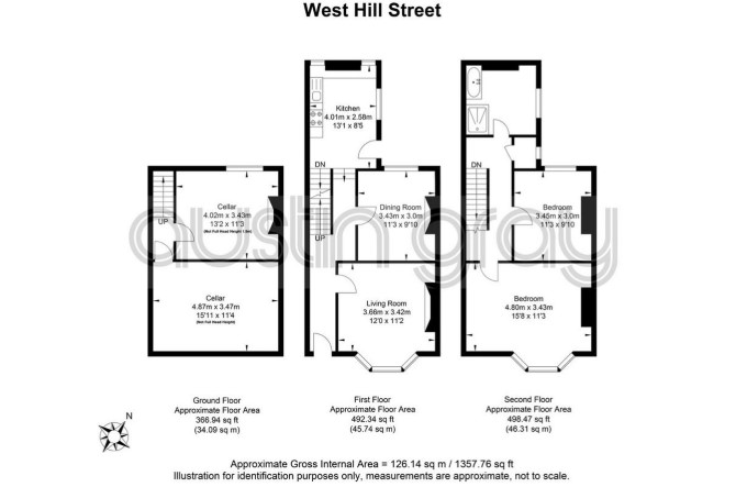 LOWER GROUND FLOOR Cellar - 4.87 x 3.47 Cellar (rear) - 4.02 x 3.43 GROUND FLOOR Living Room - 3.66 x 3.42 Dining Room - 3.43 x 3.0 Kitchen - 4.01 x 2.58 FIRST FLOOR Bedroom (1) - 4.80 x 3.43 Bedroom (2) - 3.45 x 3.0 Shower room - Total Floor Area - 126.14 sq.m.