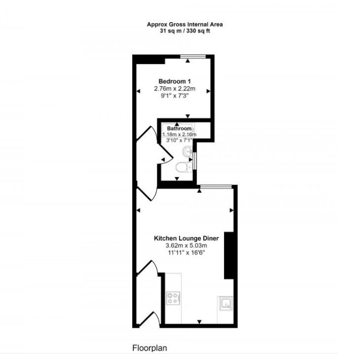 Leasehold flat within a period conversion, comprising an open plan living room/kitchen, bedroom and bathroom. There are approximately 61 years remaining on the lease.