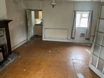Ground Floor: Hallway, lounge through to dining room, kitchen. First Floor: Landing, two bedrooms, bathroom. Outside: Walled garden to the front with sizeable overgrown side and rear garden and brick outhouse.