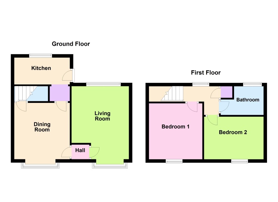 Front Door to Hallway with access to Lounge 4.3m x 5.4m with bay window to front, Dining Room 3.m x 3.3m with stairs to first floor off, Kitchen 3.3m x 1.6m with range of units.