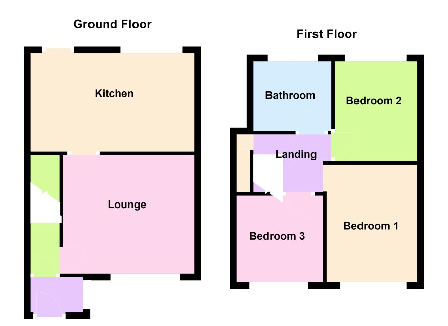 Staircase leads to landing with access to Bedroom One (front) 3.5m x 2.7m, Bedroom Two (rear) 3m x 2.7m, Bedroom Three (front) 2.6m x 2.6m max, Bathroom.