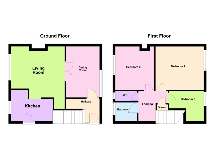 Staircase in hallway leads up to Landing (2.40m x 2.20m). Landing enables access to Bedroom 1 (3.37m x 3.71m), Bedroom 2 (3.37m x 3.06m), Bedroom 3 (2.43m x 2.80m, Bathroom (1.53m x 1.70m), WC (0.77m x 1.68m) and Landing Storage (0.58m x 0.85m).