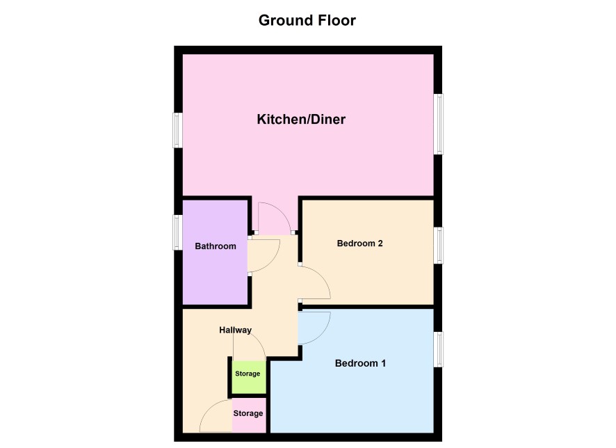 Front door opens up to Hallway (2.95m x 2.72m), which in turn enables access to Bedroom 1 (2.91m x 3.85m), Bedroom 2 (2.52m x 3.11m), Bathroom (2.48m x 1.54m), Hallway Storage (1) (0.83m x 0.81m), Hallway Storage (2) (0.82m x 0.80m) and Kitchen / Diner (4.21m x 5.98m).