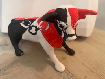 IMPORTANT NOTICE: NO FEES WILL BE CHARGED IN ADDITION TO THE BID PRICE. BULLS IN THE CITY 2025 CHARITY AUCTION ON BEHALF OF BIRMINGHAM HOSPICE By invitation only at Millennium Point, Curzon St, Birmingham B4 7AP at 7.00 pm and livestream via auctionhouse.co.uk/birmingham (registration required) Miniature Bull Sculpture painted by Celebrity and Comedian Frank Skinner