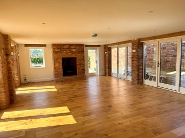 Reception Hall: A welcoming hall with a split oak staircase and access to ground and first floor rooms. Study/Snug (8'6" x 8'4"): Fitted desk and shelving, glazed doors to the front. Day Room (17'2" x 13'8"): Light-filled with windows to side and rear, French doors to outside, tiled flooring with underfloor heating. Guest Cloakroom/WC: Featuring a contemporary freestanding basin and WC, tiled splashbacks, and a window to the side. Substantial Open-Plan Kitchen/Family/Dining Room (44' max / 22' min x 19'4" max / 14'2" min): Fitted with high-gloss handleless units, granite work surfaces, a large central island, and integrated appliances including a gas hob, ovens, fridge/freezer, dishwasher, and twin pantry cupboards. Opens to the family/dining area with a feature fireplace, additional storage, and access to a mezzanine landing. Utility Room (13' x 7'1"): Co-ordinated cabinetry, granite worktop, sink, and access to the boiler room. Main Lounge (40'6" x 20'3"): A grand, light-filled living space with multiple French doors, rustic brick fireplace, inset log effect stove, and curved feature wall with lighting.