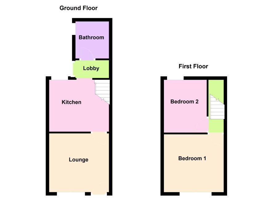 Lounge 3.6m x 3.5m with door to Kitchen 3.6m x 3.5m with stairs to first floor off, door to Inner Hallway with access to outside and door to Bathroom.