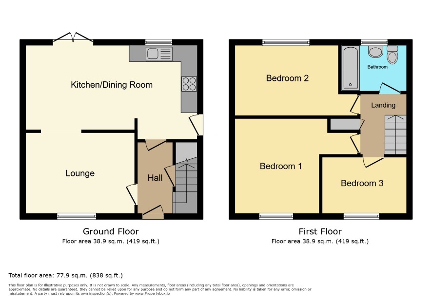GROUND FLOOR Hallway: Lounge: 12 ft 10 in x 9 ft 8 in Kitchen/Diner: 20 ft 8 in max x 11 ft 3 in FIRST FLOOR Bedroom 1: 14 ft 9 in a 11 ft 5 in Bedroom 2: 14 ft 9 in x 8 ft 2 in Bedroom 3: 10 ft 2 in x 6 ft 9 in Barthroom: