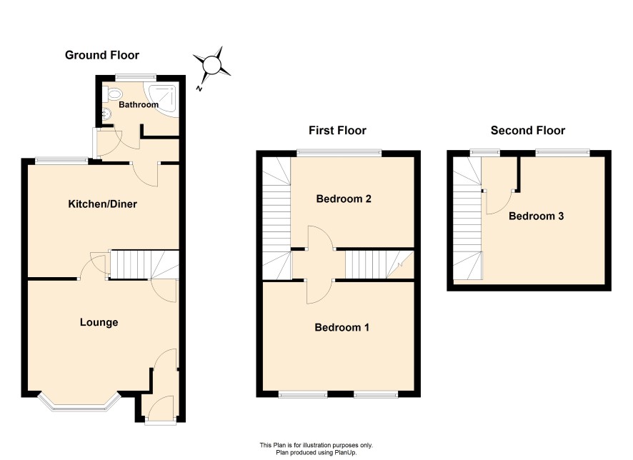 GROUND FLOOR Porch/hallway Lounge: 15 ft 10 in x 13 ft 8 in Kitchen/diner: 11 ft 1 in x 15 ft 1 in Rear hall: Shower room: FIRST FLOOR Bedroom 1: 14 ft 6 in x 10 ft 10 in Bedroom 2: 15 ft 2 in x 8 ft 1 in SECOND FLOOR Bedroom 3: 15 ft 3 in max x 12 ft 9 in