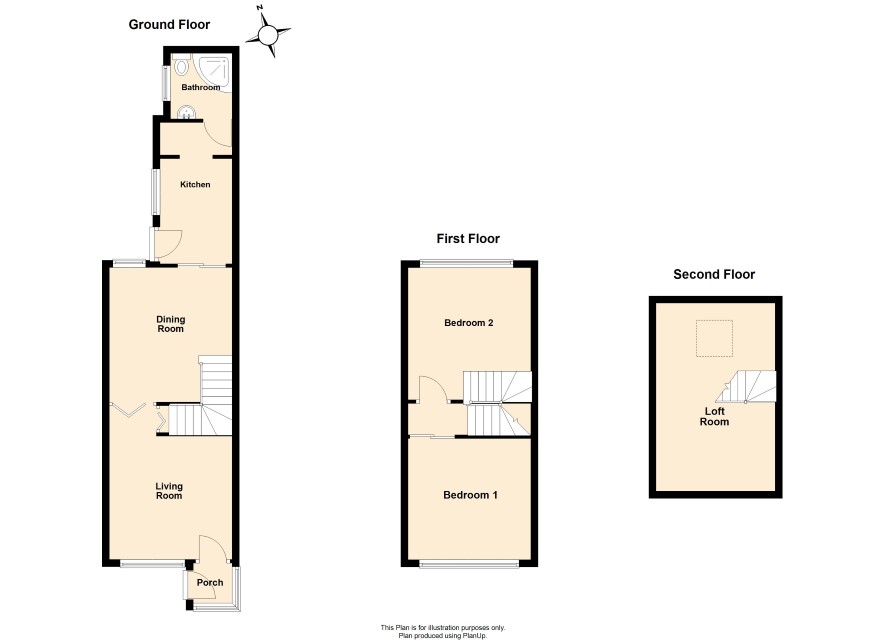 GROUND FLOOR Porch: Lounge: 11 ft 2 in x 11 ft Dining room: 11 ft 10 in x 11 ft 2 in Kitchen: 9 ft 11 in x 6 ft 7 in Shower room: FIRST FLOOR Bedroom 1: 11 ft 5 in x 9 ft 5 in Bedroom 2: 11 ft 2 in x 8 ft 8 in SECOND FLOOR Loft room: 17 ft 2 in max x 11 ft 3 in max