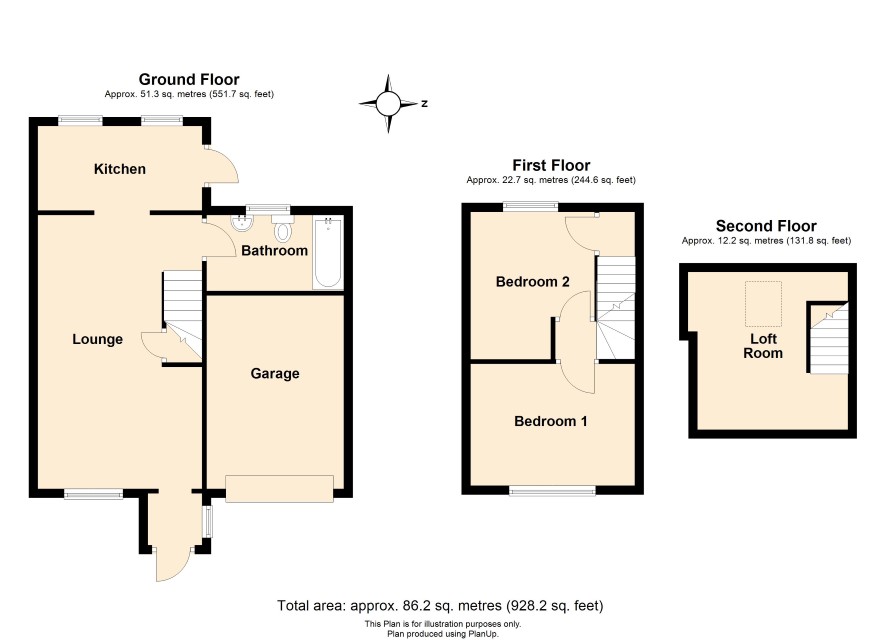 GROUND FLOOR Porch: Lounge/Dining room: 20 ft 6 in max x 12 ft 2 in max Kitchen: 13 ft 1 in 12 ft Bathroom: FIRST FLOOR Bedroom 1: 10 ft 3 in x 10 ft 1 in Bedroom 2: 10 ft 1 in x 9 ft 6 in SECOND FLOOR Loft room: 10 ft 7 in x 9 ft 9 in