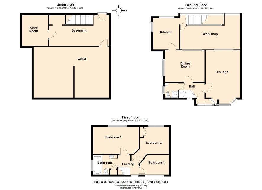 UNDER CROFT/BASEMENT 29 ft 4 in x 26 ft 1 in (overall size) GROUND FLOOR Porch and hallway Lounge: 17 ft 10 in x 10 ft Dining room: 14 ft 7 in x 9 ft 11 in Kitchen: 9 ft 6 in x 8 ft 9 in Shower room: Lean to/Workshop: 19 ft 7 in max x 6 ft 5 in FIRST FLOOR Bedroom 1: 15 ft 10 in max x 9 ft 7 in Bedroom 2: 11 ft 2 in max x 9 ft 10 in Bedroom 3: 9 ft 11 in x 5 ft 9 in Bathroom: