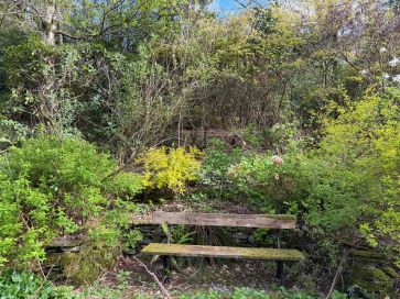 A garden of roughly one acre including a pond, timber shed and four stone built stores.