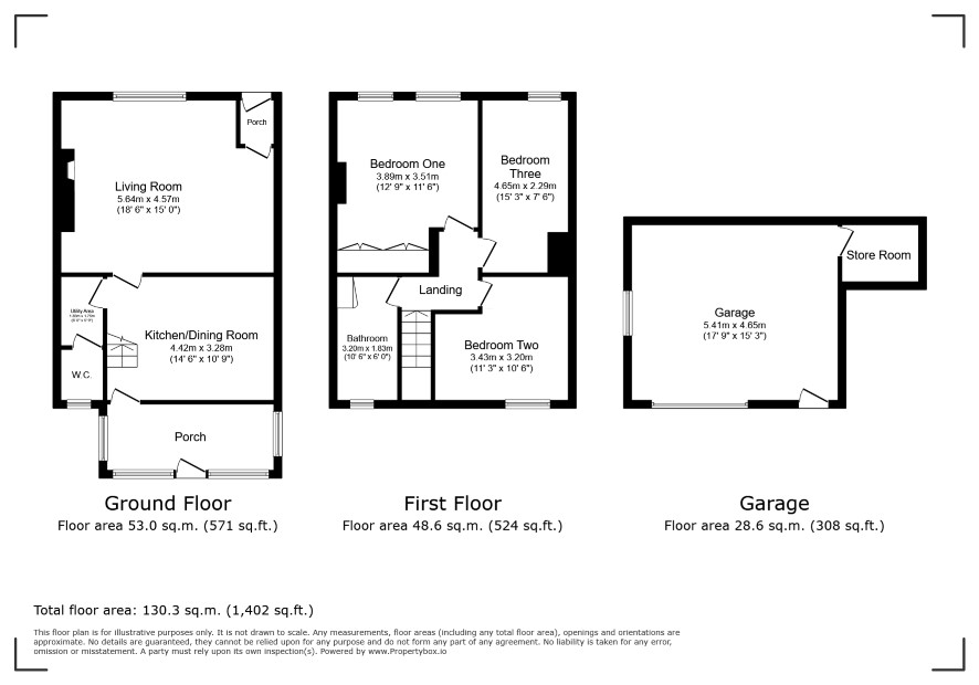 Forecourt garden. Rear garden and Garage 17'9 x 15'3 with Store 7'3 x 5'6 - see the title plan.