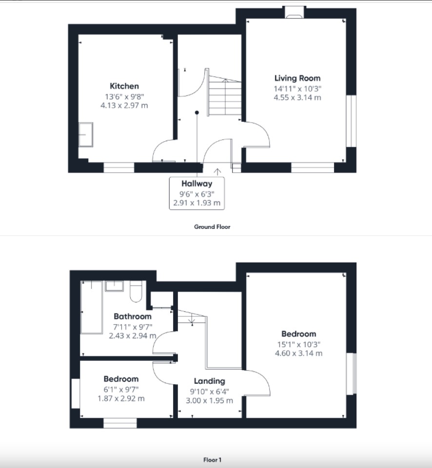 Bedroom - 4.60m x 3.14m Bedroom - 2.92m x 1.87m Bathroom - 2.94m x 2.43m