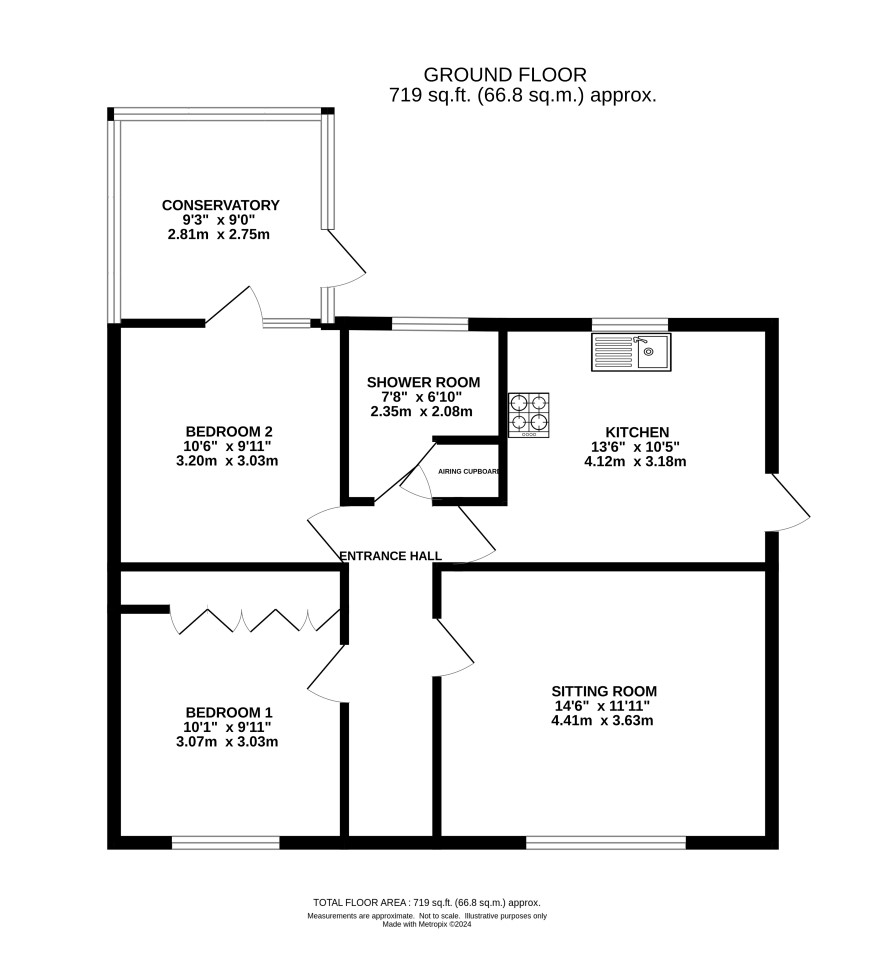 Entrance hall, Sitting room, kitchen/breakfast room, two double bedrooms with conservatory off bedroom two and a shower room.