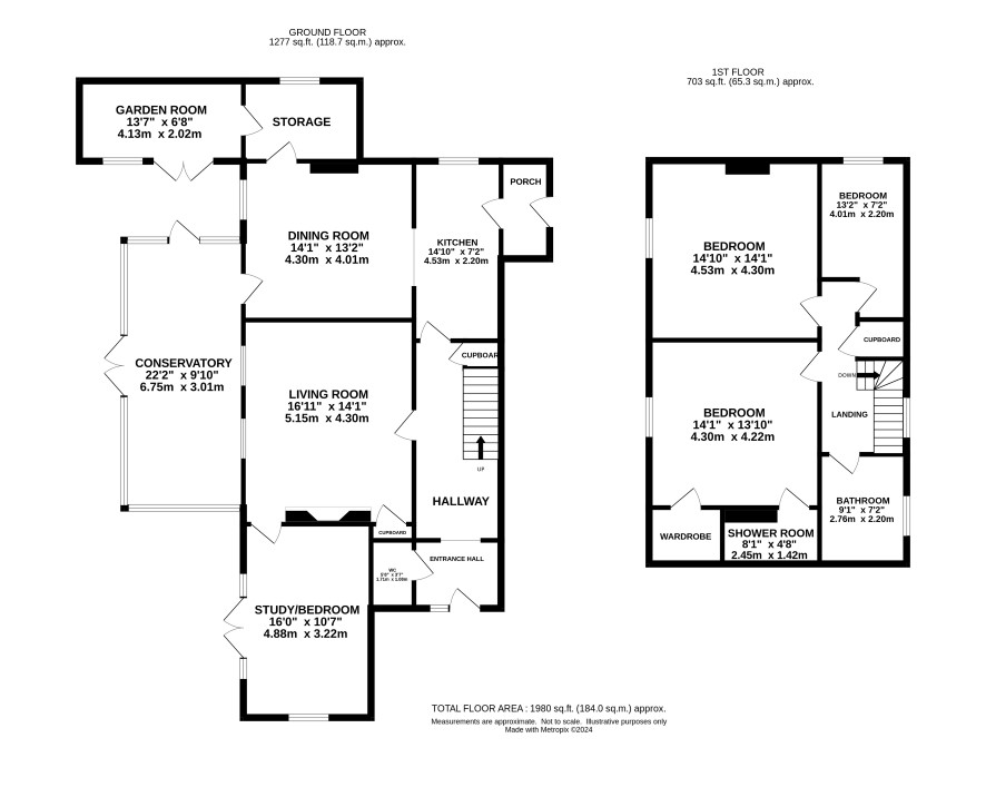 Veranda leading to entrance lobby, cloakroom and entrance hall with stairs to the first floor. Sitting room, study/bedroom 4, kitchen, dining room, conservatory, garden room.