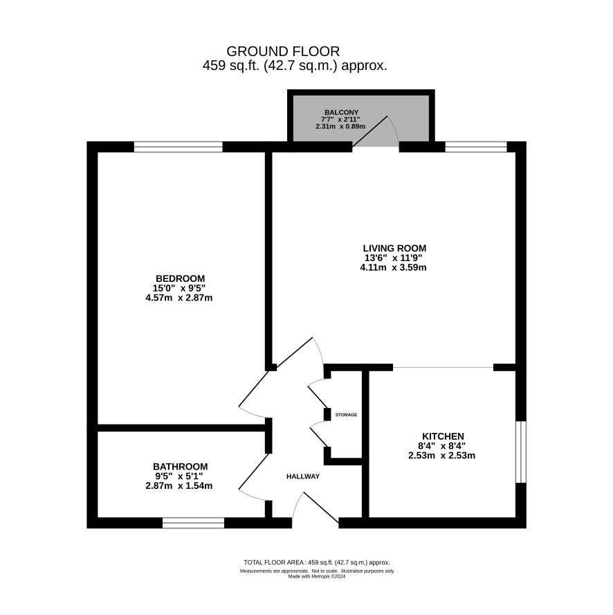 Personal Entrance Door, leading to Entrance Hall 4'8" max x 8'2" with built in cupboards Living Room 13'4" x 11'8" door to Balcony 7'6" x 2'9" Kitchen 8'2" x 8'2" Bedroom 15" x 9.5" Bathroom/WC 9'4 x 5'