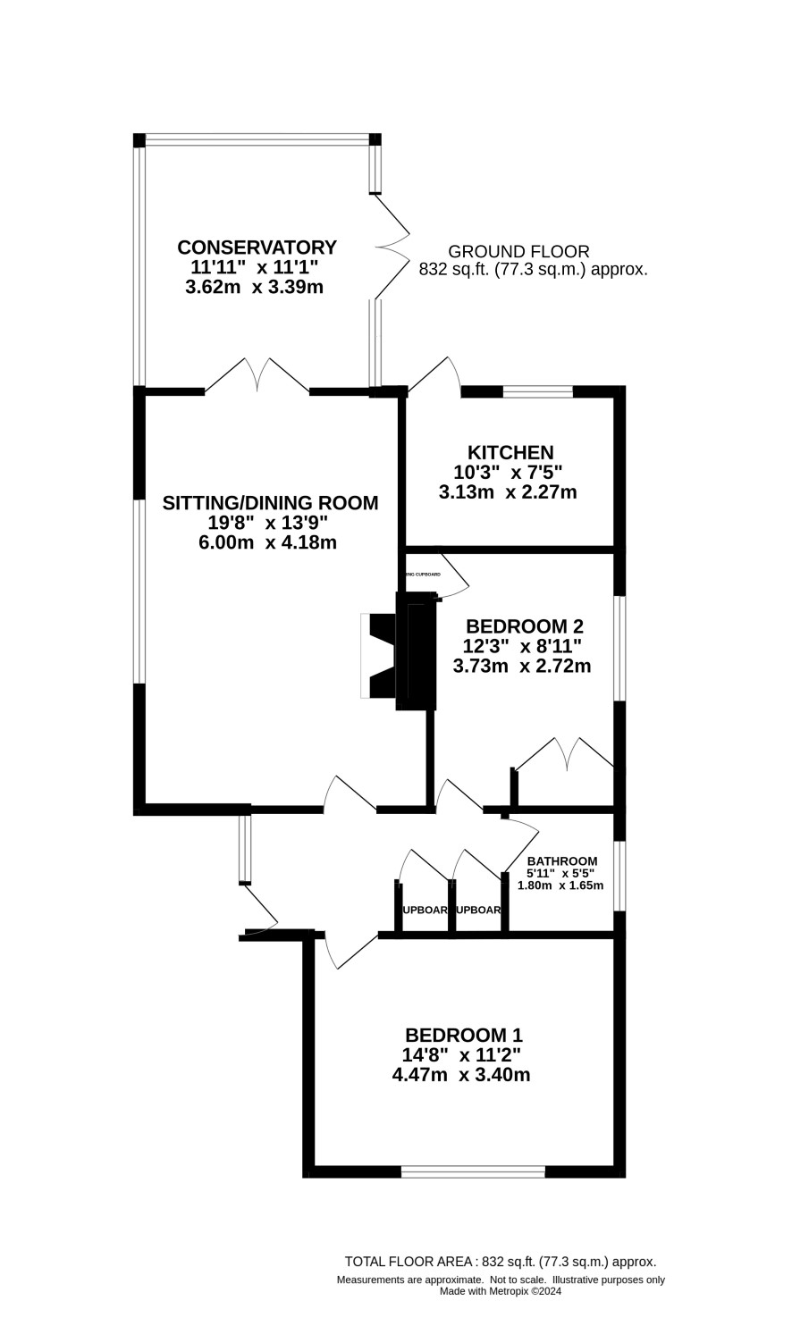 Entrance Hall, Bedroom to front, bathroom, bedroom two, sitting room/dining area, kitchen and conservatory.