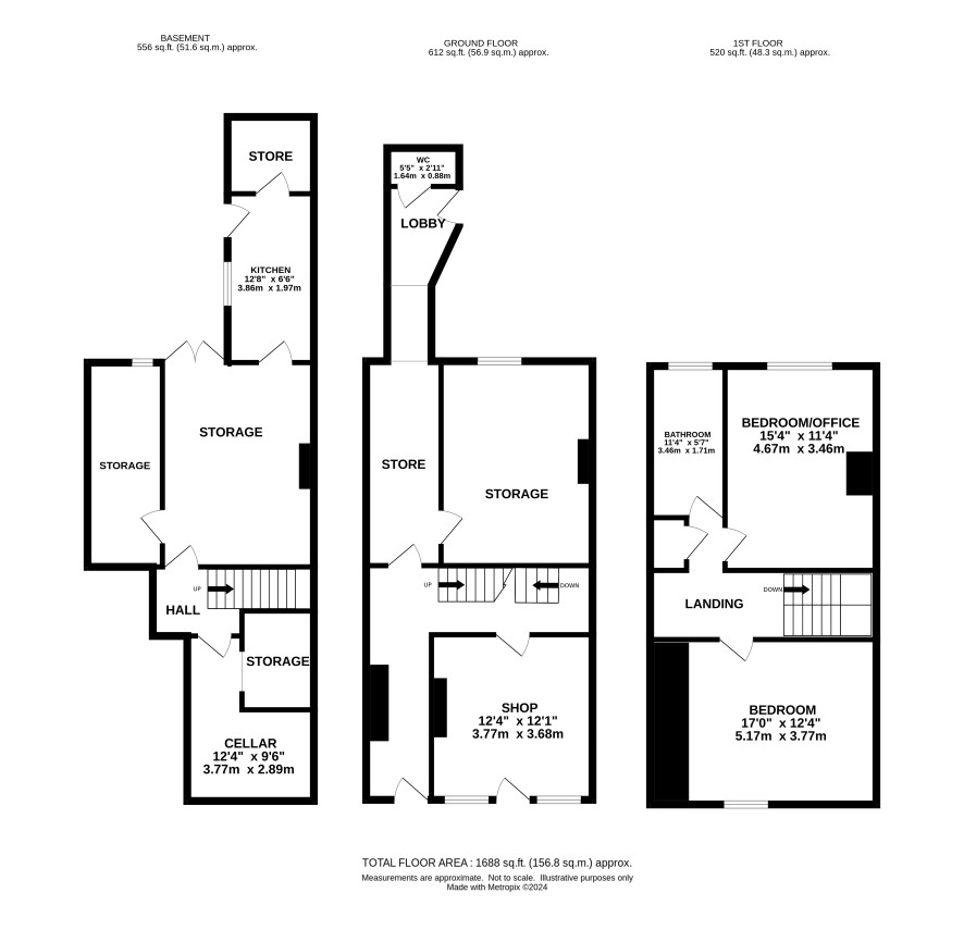 Ground Floor: shop, side hall, rear office Basement: Cellarage and stores, former kitchen First Floor: Offices