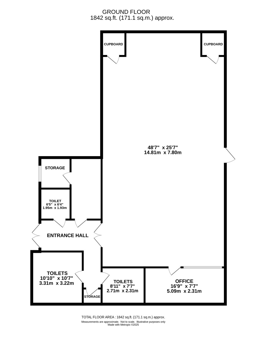 Main Hall 115.88 sq m (1,247 sq ft) Rear Area 11.10 sq m (119 sq ft) Kitchen 3.13 sq m (34 sq ft) Office 7.55 sq m (81 sq ft) Total: 137.58 sq m (1,481 sq ft)