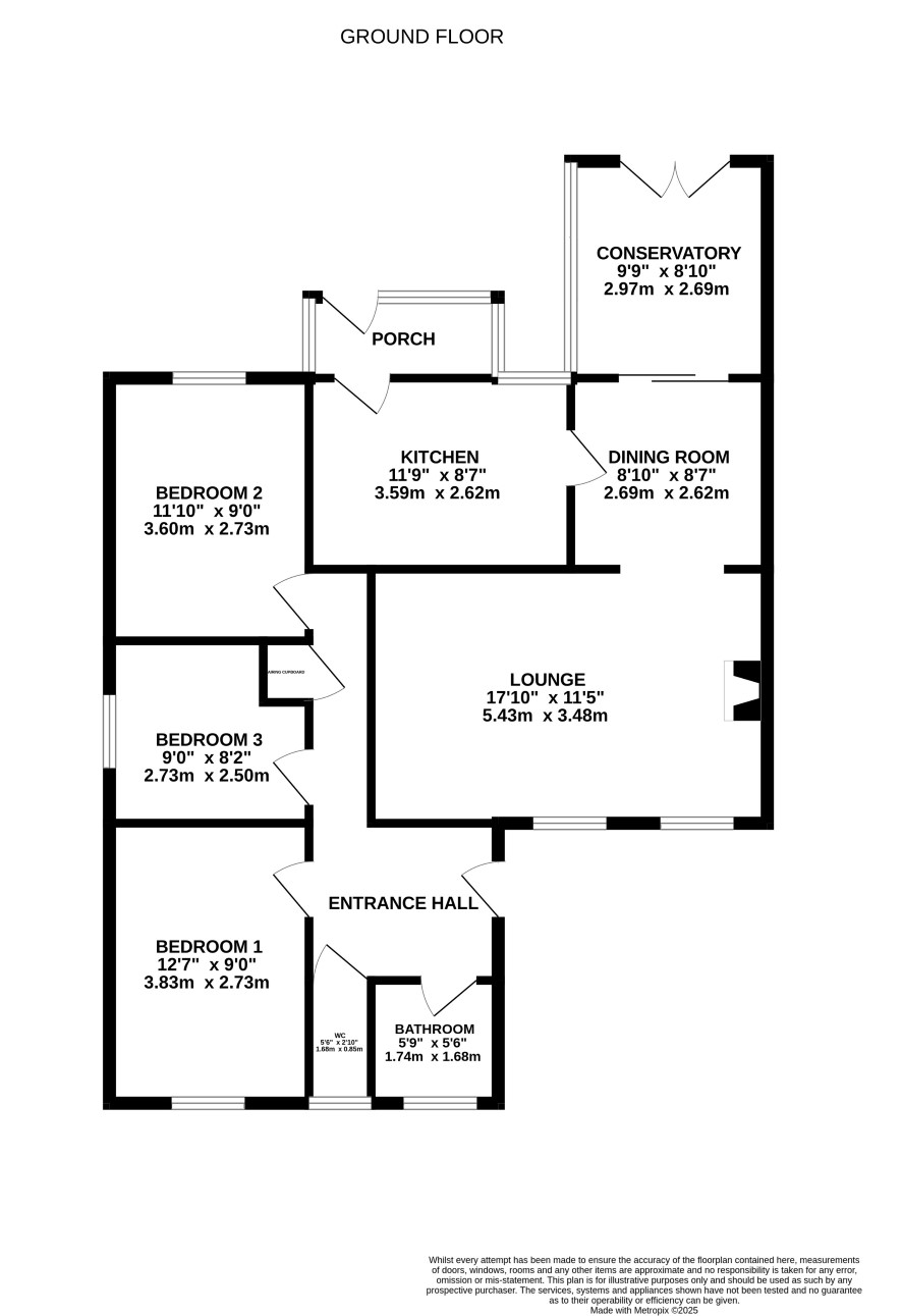 Entrance hall, bathroom, wc, three bedrooms, lounge, kitchen, dining room, conservatory, porch
