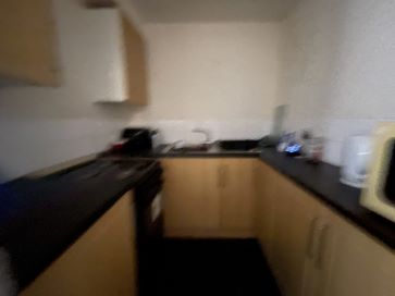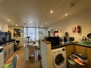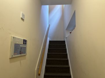 Split level Flat with sitting room and kitchen on first floor, and bedroom and bathroom on floor above.