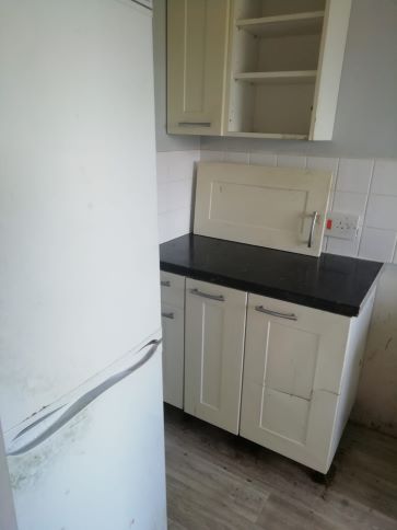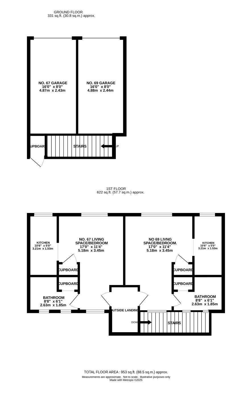 Exterior stairs lead up to the entrance to both flats, each flat has main living space/bedroom area with kitchen and separate bathroom.