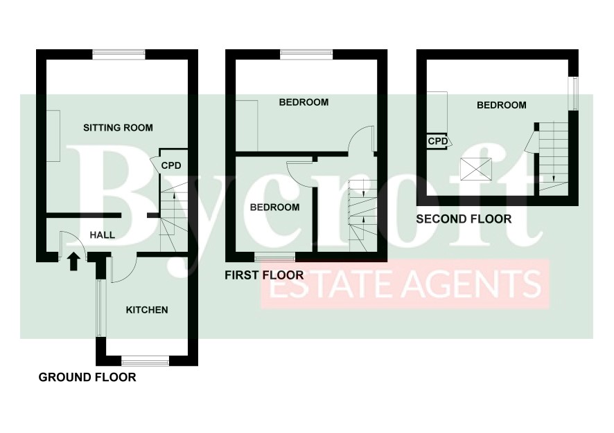 Ground floor: entrance hall, kitchen, sitting room First floor: Landing, bathroom, bedroom Second floor: bedroom Outside: courtyard garden area with shingled residence parking area.