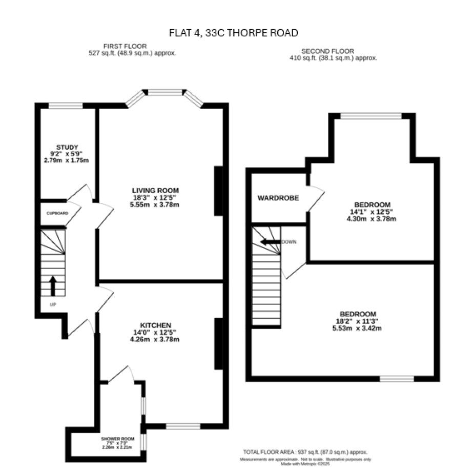 Flat 3: Entrance hall, bedroom / sitting room, bathroom, kitchen (EPC C, 27 sq/m) Flat 4: Entrance hall, kitchen / dining room, shower room with wc, study (EPC D, 87 sq/m)