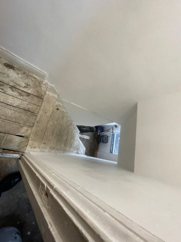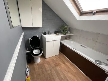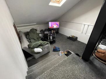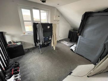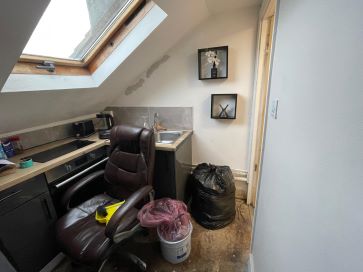 A second floor one bedroom/studio flat, currently let, producing £9,900 p.a. The property includes a living space with steps down to a bedroom area, separate bathroom, small kitchen area and separate storage space.