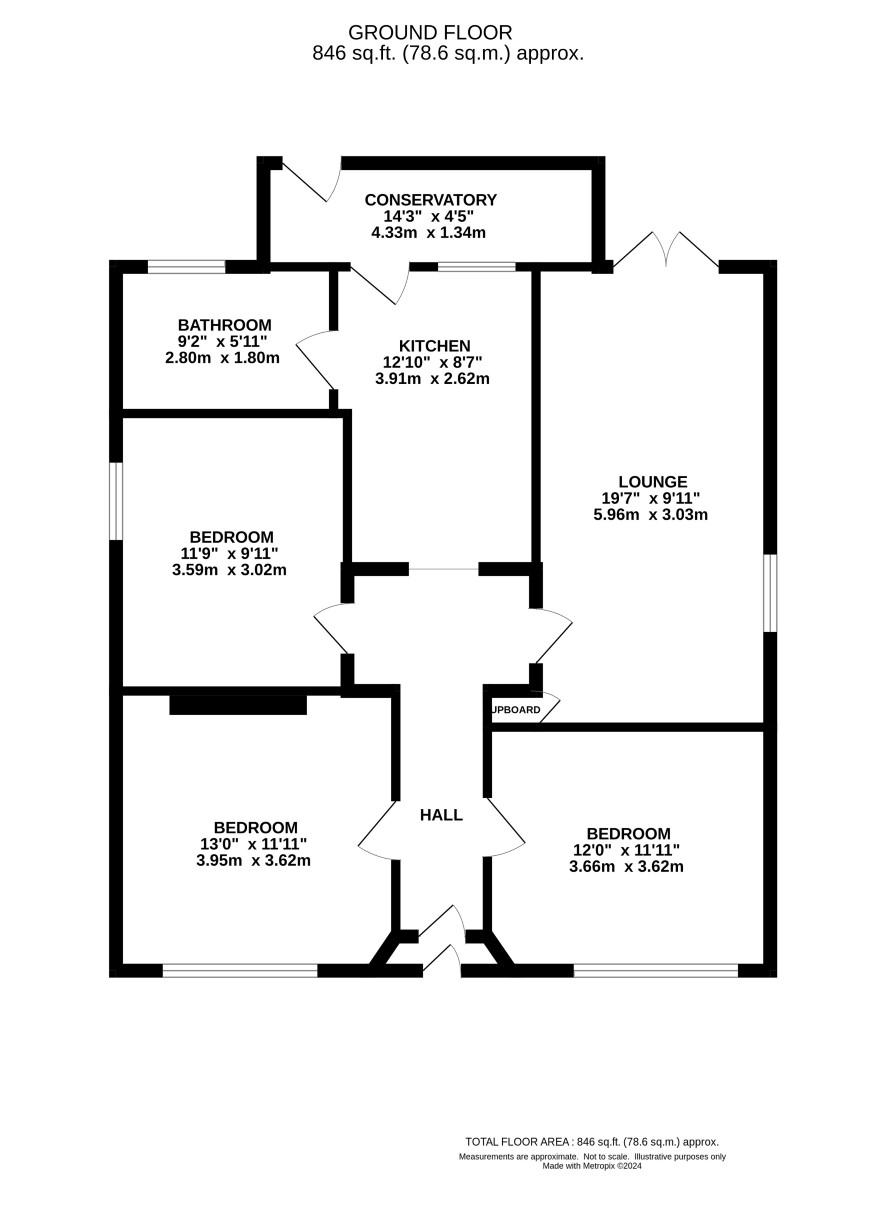 Entrance hall, three bedrooms, bathroom, kitchen, lounge, and conservatory.
