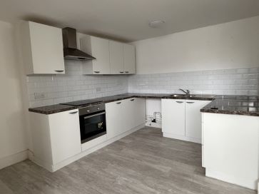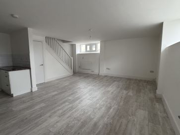 Entrance hall into open plan living area with kitchen and stairs up to landing, bedroom, separate bathroom