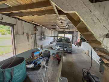 Front and rear gardens along with a private driveway, two garages, large workshop