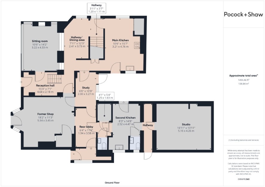 Reception hall, dining area, kitchen, study, former shop, w.c. second kitchen, studio, sitting room.