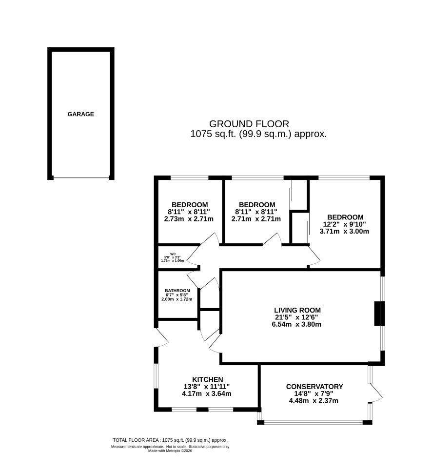 Kitchen, bathroom, wc, three bedrooms, living room, conservatory