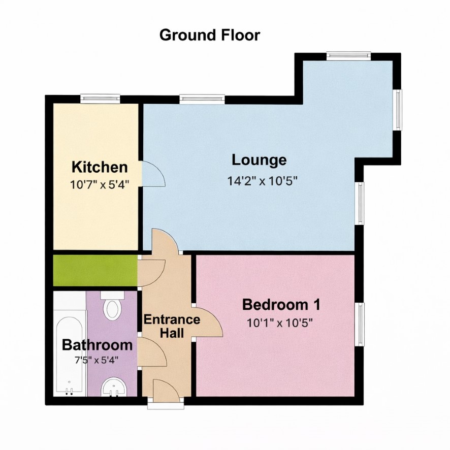 Hall, lounge, kitchen, bedroom and a bathroom.
