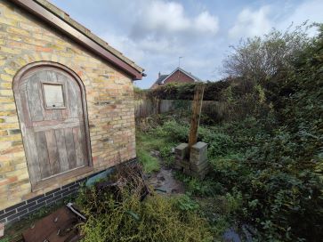 The property stands on a large, but currently overgrown, plot with vehicular access leading to a dilapidated garage.
