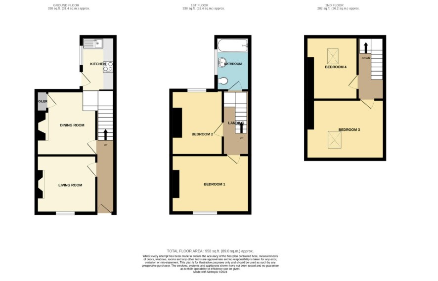 Ground Floor Entrance Hall Entrance to the property is gained via a double-glazed door to the front elevation, leading to a hall. Radiator. Stairs leading to the half and first floor landing. Doors leading to the living room and dining room. Living Room - 10'7" x 8'8" Double-glazed window and a radiator. Dining Room - 10'8" x 9'3" Double-glazed window to the rear elevation, radiator. Built-in cupboard to a recess and an understairs storage cupboard. Doorway through to the kitchen. Kitchen - 8'8" x 5'7" Offering a modern range of wood-effect wall and base units with contrasting worktop surface areas with splashbacks and an inset sink unit. Built-in electric oven and hob with an extractor over. Space for a washing machine and a fridge /freezer. Double-glazed window and door to the side elevation. Half Landing Door leading to the bathroom. Bathroom Comprised of a white three-piece suite which includes: a panelled bath with a shower over, a pedestal wash hand basin and a low-level WC. Wood effect flooring and part-tiled walls. Double-glazed window and a radiator. First Floor First Floor Landing Stairs leading to the second floor. Doors leading to bedrooms one and two. Bedroom One - 12'3" x 10'7" Double glazed window to the front elevation, radiator. Bedroom Two - 10'8" x 7'1" Double glazed window to the rear elevation, radiator. Second Floor Doors leading to bedrooms three and four. Bedroom Three - 10'8" x 12'0" Velux style window and a radiator. Bedroom Four - 11'0" x 8'3" Velux style window and a radiator.