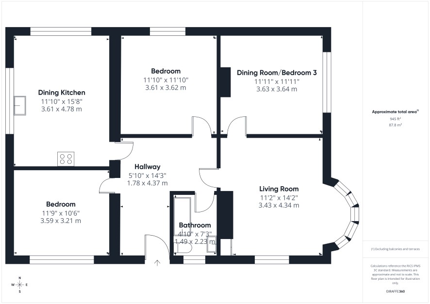 Hallway - 5'10" x 14'3" (1.78m x 4.37m) Living Room - 11'2" x 14'2" (3.43m x 4.34m) Dining Room/Bedroom Three - 11'11" 11'11" (3.63m x 3.64m) Dining Kitchen - 11'10" x 15'8" (3.61m x 4.78m) Bedroom One - 11'10" x 11'10" (3.61m x 3.62m) Bedroom Two - 11'9" x 10'6" (3.59m x 3.21m) Bathroom - 4'10" x 7'3" (1.49m x 2.23m)